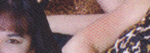 Example of 4-color process silkscreen with a white background. Photographic images are color-separated into 4 colors - cyan, magenta, yellow, and black. These colors are recombined on the printing press to simulate the original image. Here you can see a close-up view of 120 line-screen printing. The image is a bit coarse and interference patterns from the screens appear in some areas. Those interference patterns are called moiré (pronounced mwar-ray) patterns. Moiré is always worse on CD labels because the ink is more opaque and due to the lower line screen. Note that the copyright line above is knocked out of black ink only. Knocking tiny text out of a 4-color picture is a very bad idea because of the low line screen (133 lines per inch) and due to the inherently bad register (alignment) in the silkscreen process. See below for a close-up view of a 4 color knockout: